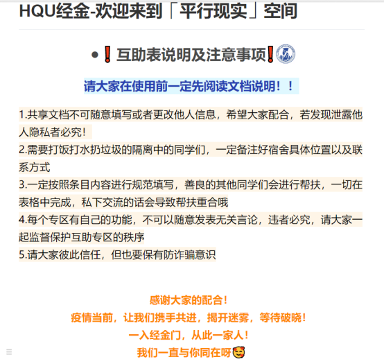 据了解,“平行现实空间”共享文档截至目前已有上百名学子进行使用。利用信息共享的手段,成功帮助许多学子消除信息隔阂和疫情恐慌,用乐观和积极向上的精神互助互爱,自我管理,传递身边的美好,并且更清楚地了解学院信息和增加人与人在疫情期间心灵的联系。