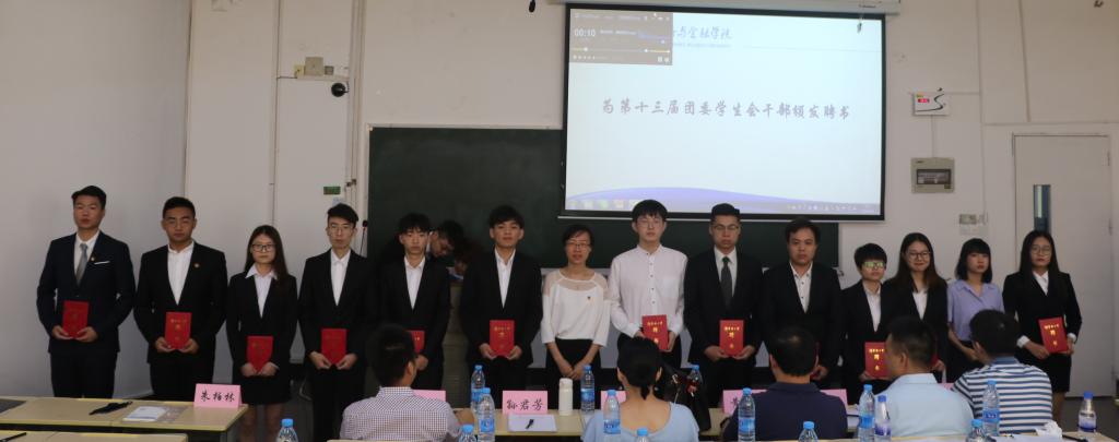 紧接着由到场嘉宾为第十三届团委学生会干部颁发聘书并合影留念。随后大会听取学生会副主席张雨星宣读筹备情况工作报告,以及学生会副主席陈阳宣读审议通过代表资格审查报告,学生团委副书记王一航做团委工作报告以及学生会主席张洪源做学生会工作报告,大会通过各项审议及报告。
