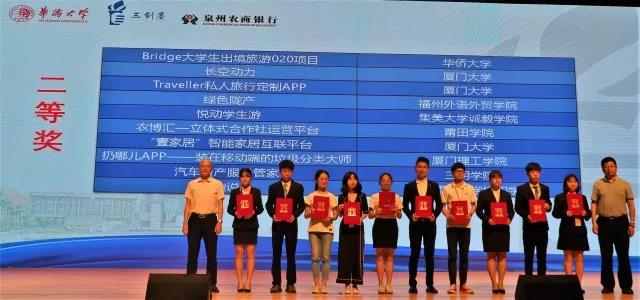 下午14时30分,决赛在华侨大学陈嘉庚纪念堂正式开始,每支参赛队伍向在座评委和观众进行了别开生面的项目展示,他们各显神通,表现出自己团队的风采。十支队伍经过两个小时的激烈角逐以及评委的认真甄选,华侨大学的“汉安团队”跨境电商项目、厦门大学的身临企境、集美大学的青春桥4.0等三支队伍斩获特等奖,福建江夏学院的破壳行动—福州博世达电子商务有限公司、福州外语外贸学院的手游电商行销手法创新潮、集美大学的粥而复食、福建江夏学院的爱小时光——基于大学生群体的新型亲子沟通模式等四支队伍荣获一等奖,厦门大学的长空动力等20支队伍获得二等奖,厦门理工学院的皆茶农队伍等30支队伍获得三等奖。