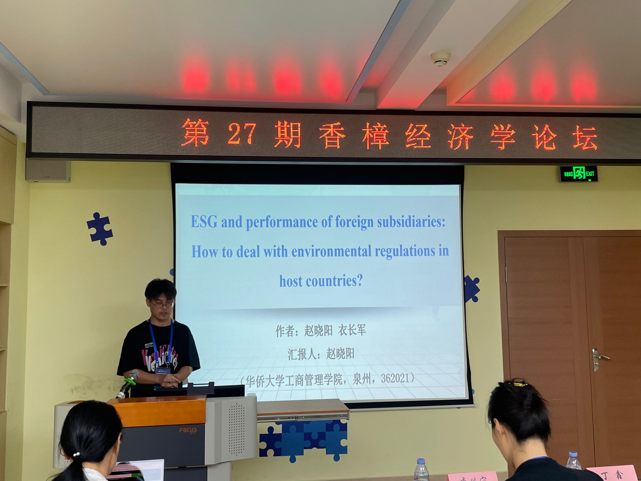华侨大学赵晓阳博士生以“Environmental, Social, Governance Scores and Performance of Foreign Subsidiaries: How to Deal with EnvironmentalRegulations in Host Countries?”为题,探讨了跨国公司ESG得分与海外子公司的财务绩效之间的关联,并考察了东道国环境法对海外子公司财务绩效的调节作用。