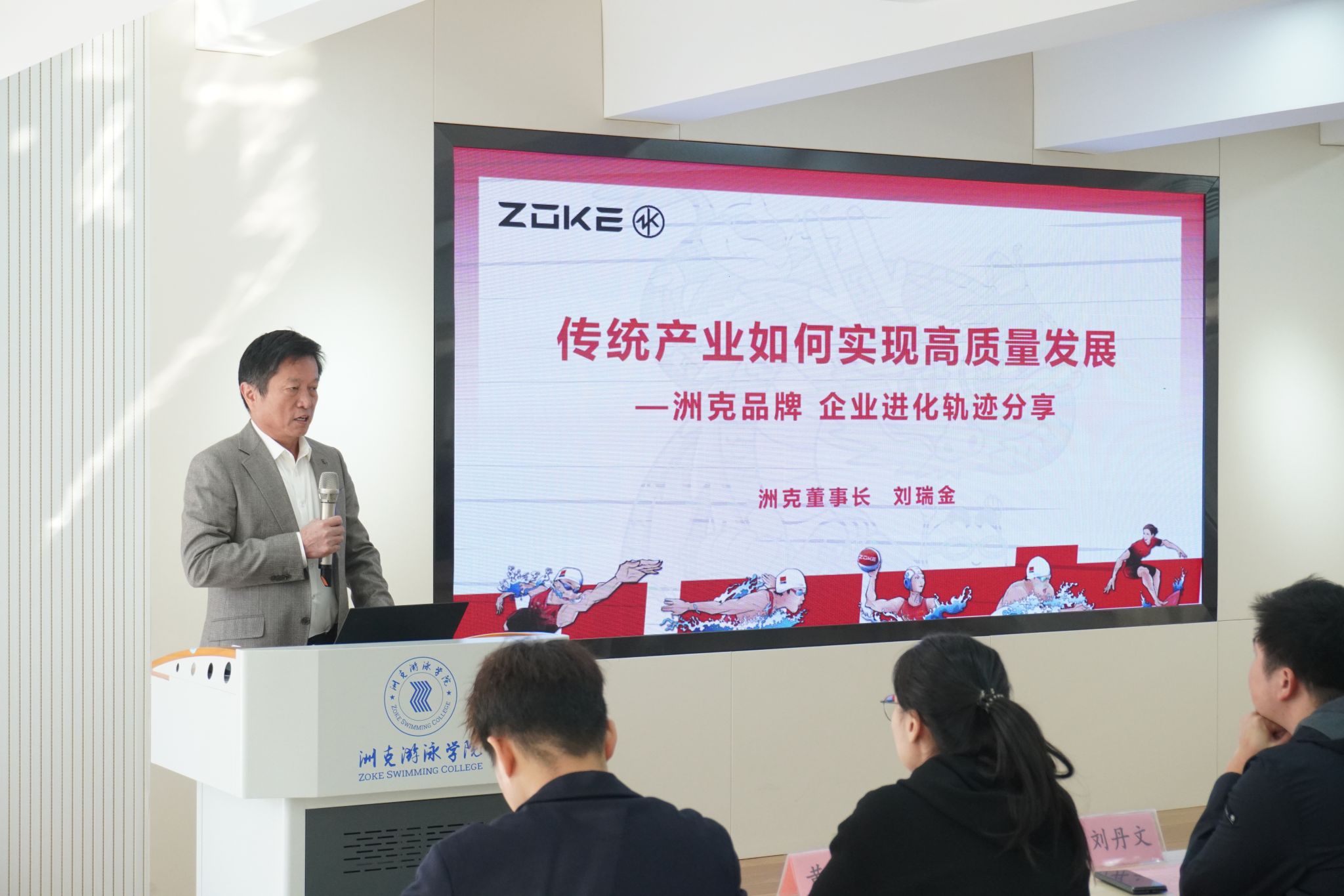 本次活动由会议交流与实践考察两部分构成,交流会上,洲克品牌营运中心刘丹阳总经理与克拉克体育用品有限公司刘瑞金董事长先后介绍了ZOKE品牌战略优势以及该公司从传统产业走向高质量发展的进化轨迹。从生产工厂、品牌孕育到平台搭建、游泳学院建设,洲克既做到了深耕品牌经营、拓展产品线,又发展了电商+社群的新型营销方式,很好地适应了互联网时代高速发展的要求。除公司发展介绍外,刘瑞金董事长还特别提及产教融合的重要性,学历不等于技能,为适应新时代发展要求,我们要将课堂从教室转到实践地。
